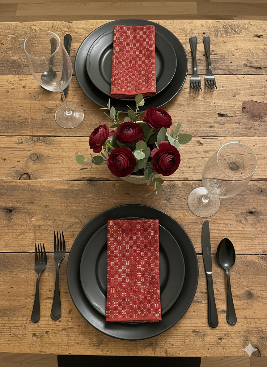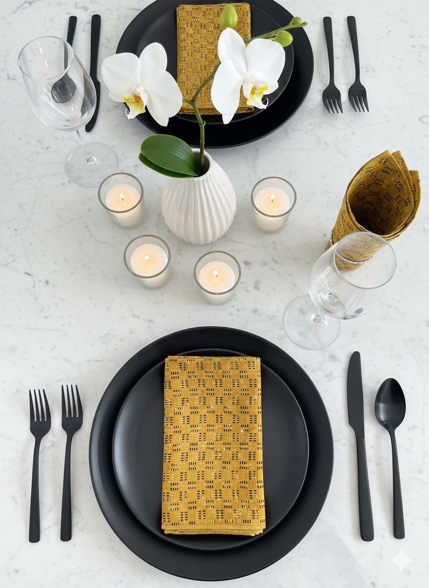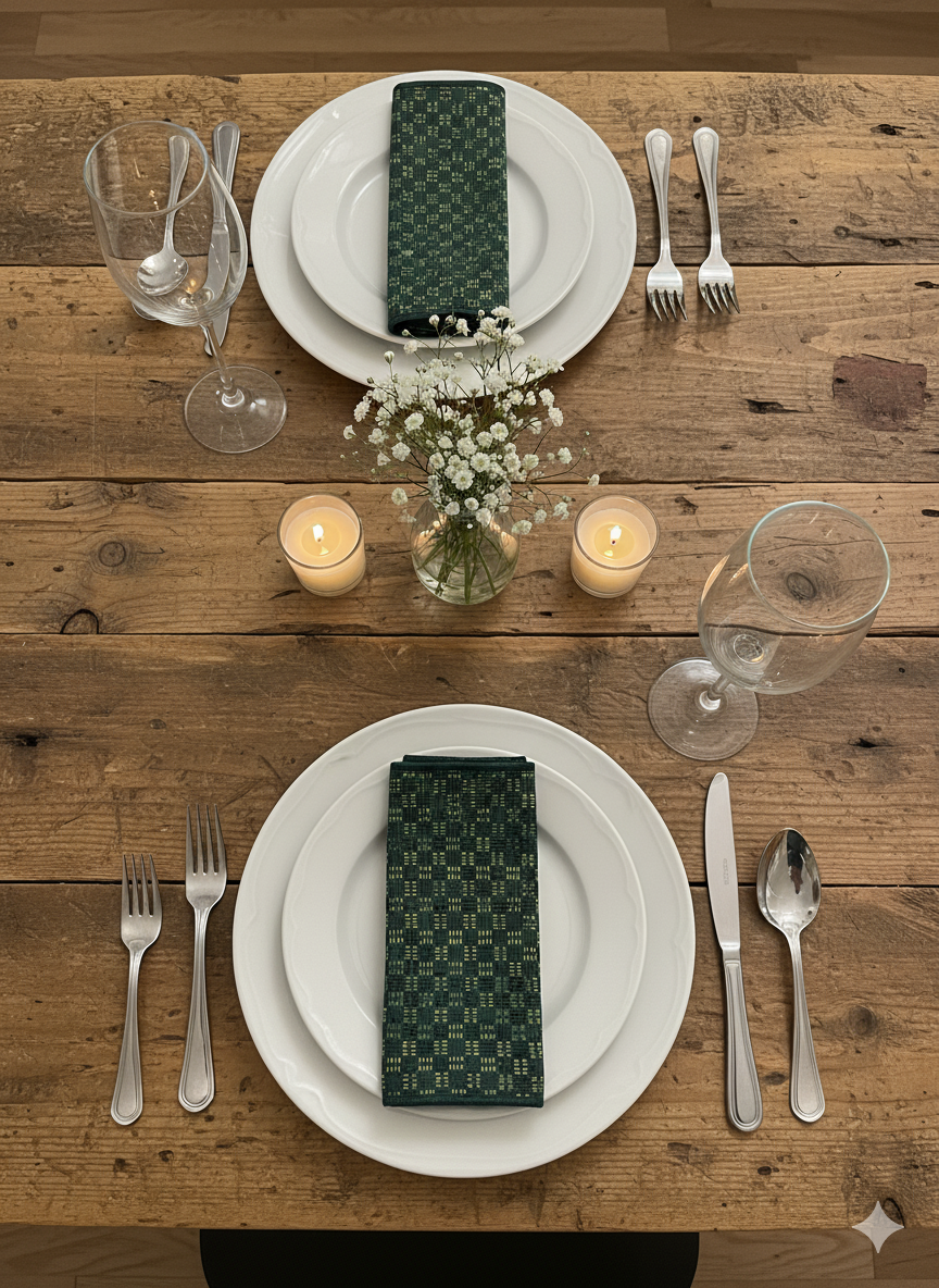 Sett med to håndtrykkede servietter av høy kvalitet. Mønsteret er håndtrykt med tradisjonelle indiske blokktrykkteknikker kjent som Ajrakh. Et tradisjonelt håndverk som gir hvert stoff et unikt og dekorativt utseende.