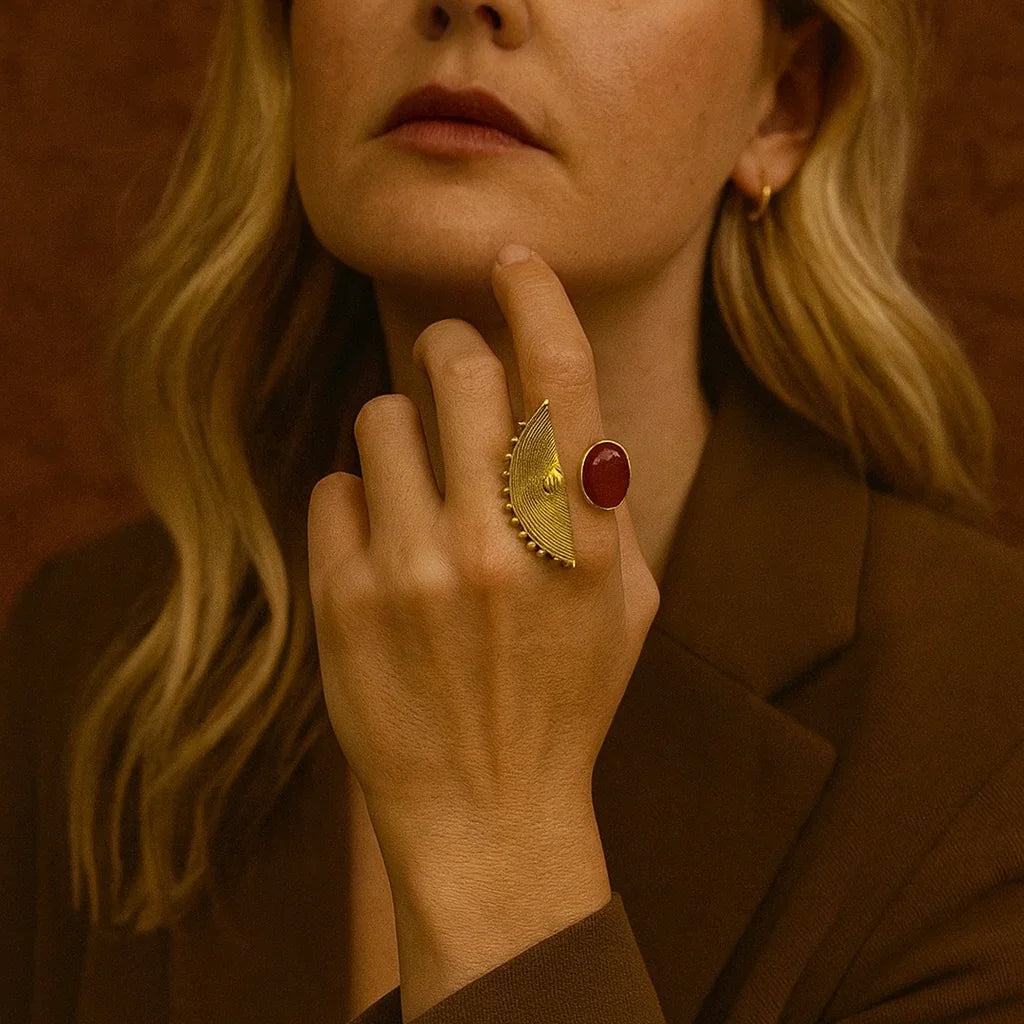 - Product Description: A statement brass ring set with a deep red stone, framed by dotted details and triangular carvings. Bold yet elegant, it carries the strength of tradition shaped into modern form.