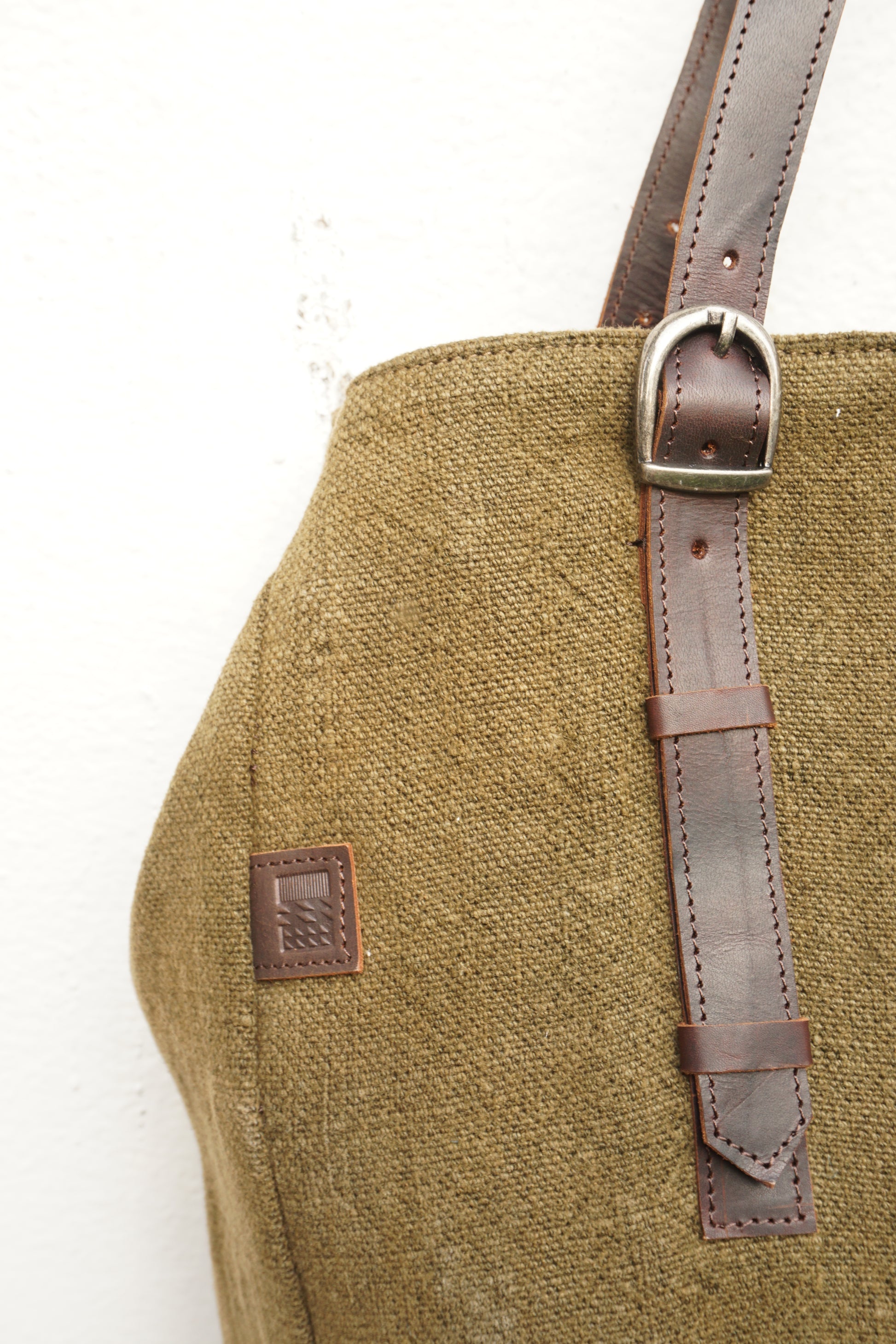 Materials: Vintage Washed Burlap (Jute), Genuine Leather, Metal Hardware.